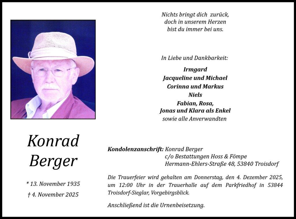 Die Trauerfeier wird gehalten am Donnerstag, den 4. Dezember 2025, um 12:00 Uhr in der Trauerhalle auf dem Parkfriedhof in 53844 Troisdorf-Sieglar, Vorgebirgsblick.