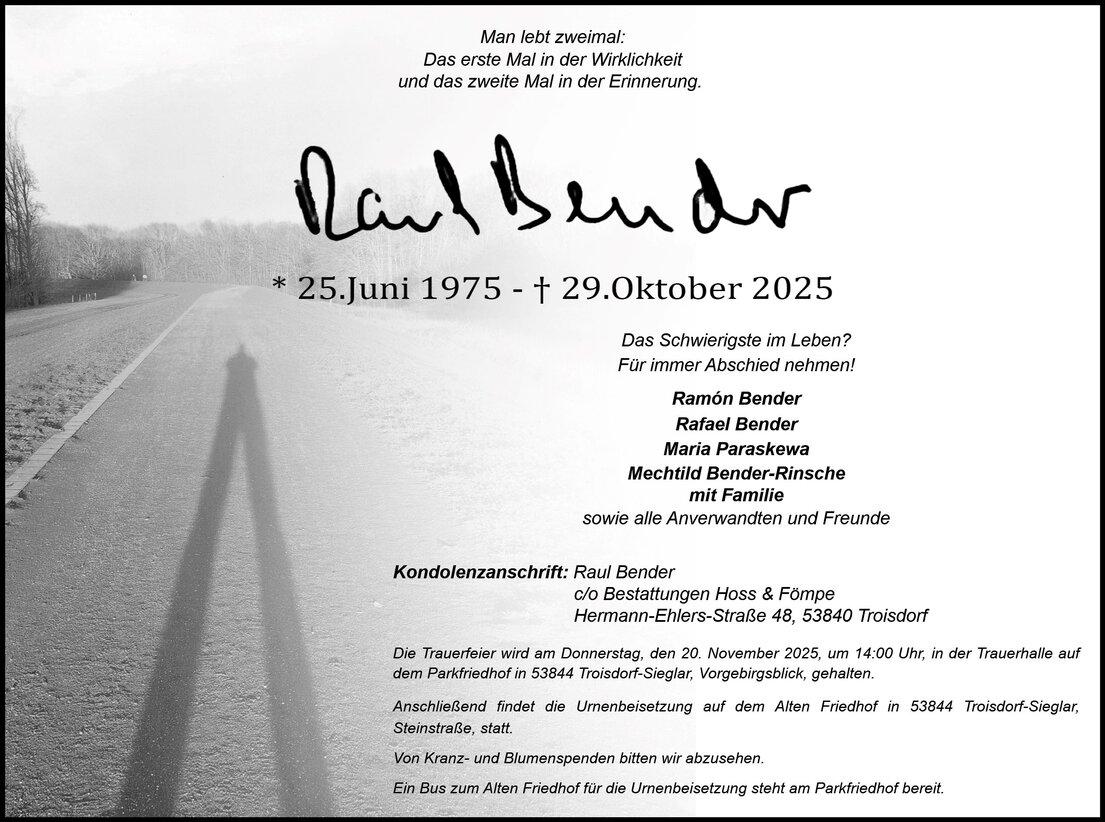 Die Trauerfeier wird gehalten am Donnerstag, dem 20. November 2025, um 14.00 Uhr in der Trauerhalle auf dem Parkfriedhof in 53844 Troisdorf-Sieglar, Vorgebirgsblick.