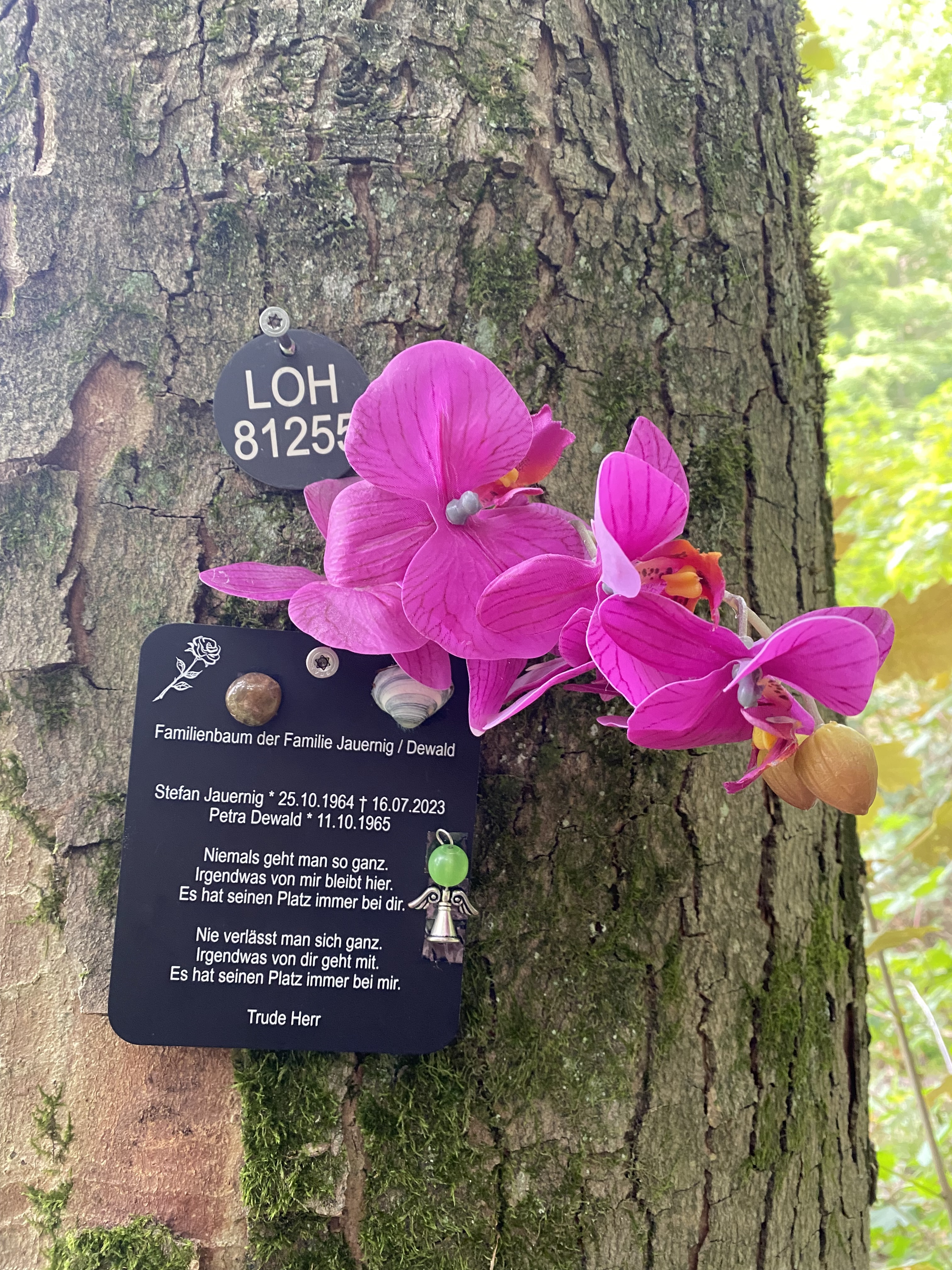 Mit diesen Worten möchte ich Sie begrüßen, zur Trauerfeier für Stefan Jauer- ning. Mein Name ist Jonas Ben Châabane. Ich bin Trauerredner und Trauer- begleiter aus Köln und ich durfte diese Feier mit seiner Frau Petra vorberei- ten. Petra hat natürlich versucht, so gut wie möglich, für weitere Menschen, die Stefan nah standen, mit zu erzählen. Allen voran selbstverständlich für Stefans Tochter. Mit Jasmin habe ich auch noch telefonieren können, und ein fast lebenslanger Freund, Friedemann, hat mir auch noch ganz persönliche Erinnerungen aufgeschrieben. Das war wertvoll. Schließlich wollte ich versu- chen Stefan durch die Geschichten ein wenig kennenzulernen. Sie alle haben sicher noch ganz eigene Erinnerungen im Gedächtnis. Wir gestalten seinen Abschied gemeinsam. Es geht darum Stefan noch einmal nah zu sein. Die- sen Ort, den Wald und den Baum, zu dem wir gleich zusammen gehen wer- den, hat er sich gemeinsam mit Petra ausgesucht. Es ist schön zu wissen, dass wir hier genau richtig sind.